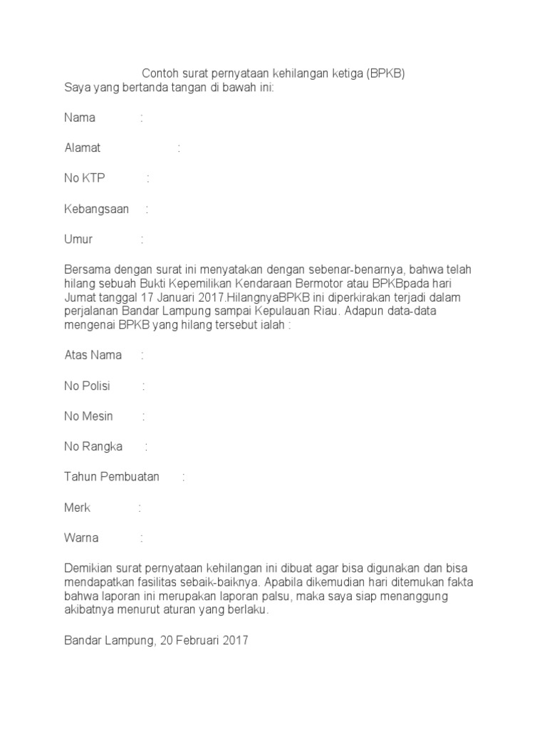 Contoh surat pernyataan kehilangan, surat ini biasanya diperlukan untuk menyatakan bahwa telah kehilangan suatu barang berharga pada saat tertentu dan pada tempat tertentu. Bukti pemasangan iklan kehilangan bpkb di media massa anda harus memasang iklan baris yang berisi berita kehilangan bpkb anda di minimal dua media cetak dengan tenggang waktu pemasangan selama dua bulan. Biasanya surat ini masuk di berkas perizinan dalam pengadaan barang dan jasa. Selain surat keterangan kehilangan dari kepolisian, kamu juga harus bikin surat keterangan dari bank. Surat keterangan bpkb tidak dalam status agunan bank.